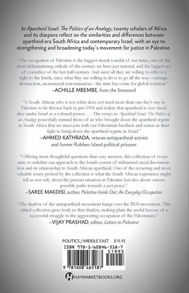 Introduction: Apartheid Israel: The Politics of an Analogy by Jon Soske and Sean Jacobs 1. On Palestine by Achille Mbembe 2. From South Africa: Solidarity with Palestine by Salim Vally 3. Neoliberal Apartheid by Andy Clarno 4. Apartheid's "Little Israel": Bophuthatswana by Arianna Lissoni 5. The Historian of Apartheid by TJ Tallie 6. Apartheid as Solution by Bill Freund 7. Along the edges of comparison by Melissa Moorman 8. Academic Freedom and Academic Boycotts by Shireen Hassim 9. Apartheid's Black Apologists by Robin DG Kelley 10. Through the Looking Glass: From South Africa to Palestine/Israel and Back Again, by Heidi Grunebaum 11. The last colony by Melissa Levin