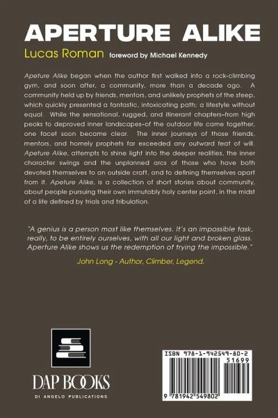"Aperture Alike: Stories of Climbing, Community, and Inner Journeys Unveiled in Lucas Roman's Captivating Tale" Embark on a literary ascent with "Aperture Alike," where Lucas Roman, inspired by a rock-climbing community, unveils a collection of short stories that transcend the sensational peaks of outdoor adventures. More than a decade in the making, this book navigates the inner character swings and unplanned arcs of friends, mentors, and unlikely prophets within the climbing world. From high peaks to the inner landscapes of devoted individuals, "Aperture Alike" illuminates the profound journeys of those who define themselves amidst the trials of an unconventional lifestyle. Join the captivating narrative that explores the immutably holy center points of its characters, offering a glimpse into the deeper realities of community, resilience, and self-discovery. Lucas Roman, draws on over a decade of experience within the climbing/adventure community to craft narratives that go beyond the rugged landscapes, delving into the inner realms of those who define themselves through their passion for the outdoors. "Aperture Alike" is not just a collection of climbing stories; it's a captivating exploration of the human spirit within a community bound by passion. Lucas Roman's narratives offer an immersive experience, shining a light on the inner journeys of characters who've devoted themselves to an outside craft while navigating the twists and turns of life's unpredictable trails. Discover the resilience, camaraderie, and immutably holy center points that make this book a compelling read for anyone seeking adventure, self-discovery, and the shared human experience.