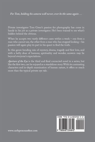 Private investigator Tom Greer's passion for photography has come in handy in his job as a private investigator. He's been trained to see what's hidden behind the obvious. When he accepts two vastly different cases within a week - one from a man who cannot see, the other from a man who has stopped looking - his passion will again play its part in his quest to find the truth. In this genre-bending mix of mystery, drama, tragedy and first love, and with a hefty dose of humour, spirituality and wonder, answers may lie beyond everyone's expectations. Aperture of the Eye is the third and final connected novel in a series, but like the first two, can be enjoyed as a standalone story. With its contrasting characters and in-depth examination of human nature, it offers so much more than the typical private eye tale.