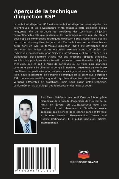 La technique d'injection RSP est une technique d'injection sans aiguille. Les scientifiques et les développeurs s'intéressent à cette discipline depuis longtemps afin de résoudre les problèmes des techniques d'injection conventionnelles tels que la douleur, les dommages aux tissus, etc. Ils ont développé de nombreuses techniques d'injection sans aiguille telles que les patchs de micro-aiguilles, les jets...etc. Ces techniques seront discutées en détail dans ce livre. La technique d'injection RSP a été développée pour surmonter les limites et les obstacles auxquels sont confrontées ces techniques, en particulier pour l'injection intradermique et sous-cutanée. Les diabétiques, qui souffrent chaque jour des injections répétées d'insuline, sont la cible principale de ce travail. Les voies conventionnelles d'injection d'insuline, que ce soit à l'aide de seringues ou de voies plus avancées comme le stylo à insuline ou la pompe à insuline, présentent de nombreux problèmes, en particulier pour les personnes âgées et les enfants. Dans ce livre, nous discuterons de l'origine scientifique de la technique d'injection RSP, du modèle mathématique du système d'injection ainsi que de deux versions différentes de prototypes, mais sans aucun détail technique, conformément au droit légal des fabricants et des investisseurs.