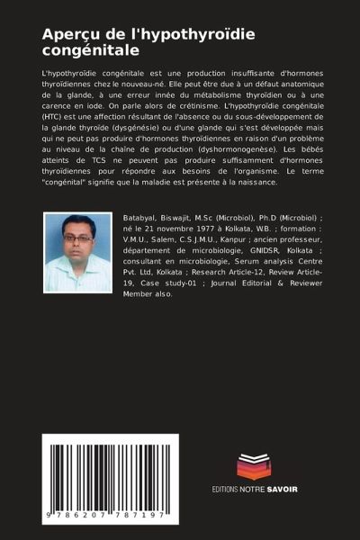 L'hypothyroïdie congénitale est une production insuffisante d'hormones thyroïdiennes chez le nouveau-né. Elle peut être due à un défaut anatomique de la glande, à une erreur innée du métabolisme thyroïdien ou à une carence en iode. On parle alors de crétinisme. L'hypothyroïdie congénitale (HTC) est une affection résultant de l'absence ou du sous-développement de la glande thyroïde (dysgénésie) ou d'une glande qui s'est développée mais qui ne peut pas produire d'hormones thyroïdiennes en raison d'un problème au niveau de la chaîne de production (dyshormonogenèse). Les bébés atteints de TCS ne peuvent pas produire suffisamment d'hormones thyroïdiennes pour répondre aux besoins de l'organisme. Le terme "congénital" signifie que la maladie est présente à la naissance.