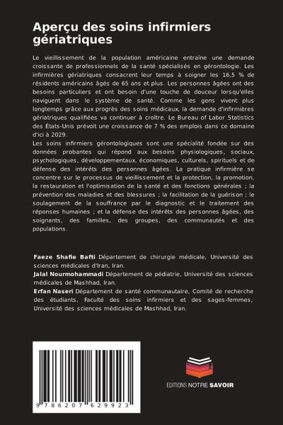 Le vieillissement de la population américaine entraîne une demande croissante de professionnels de la santé spécialisés en gérontologie. Les infirmières gériatriques consacrent leur temps à soigner les 16,5 % de résidents américains âgés de 65 ans et plus. Les personnes âgées ont des besoins particuliers et ont besoin d'une touche de douceur lorsqu'elles naviguent dans le système de santé. Comme les gens vivent plus longtemps grâce aux progrès des soins médicaux, la demande d'infirmières gériatriques qualifiées va continuer à croître. Le Bureau of Labor Statistics des États-Unis prévoit une croissance de 7 % des emplois dans ce domaine d'ici à 2029.Les soins infirmiers gérontologiques sont une spécialité fondée sur des données probantes qui répond aux besoins physiologiques, sociaux, psychologiques, développementaux, économiques, culturels, spirituels et de défense des intérêts des personnes âgées. La pratique infirmière se concentre sur le processus de vieillissement et la protection, la promotion, la restauration et l'optimisation de la santé et des fonctions générales ; la prévention des maladies et des blessures ; la facilitation de la guérison ; le soulagement de la souffrance par le diagnostic et le traitement des réponses humaines ; et la défense des intérêts des personnes âgées, des soignants, des familles, des groupes, des communautés et des populations.