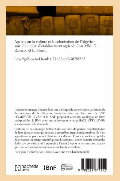 Aperçu sur la culture et la colonisation de l'Algérie: suivi d'un plan d'établissement agricole / par MM. E. Rameau et L. Binel... Date de l'édition originale: 1844 Le présent ouvrage s'inscrit dans une politique de conservation patrimoniale des ouvrages de la littérature Française mise en place avec la BNF. HACHETTE LIVRE et la BNF proposent ainsi un catalogue de titres indisponibles, la BNF ayant numérisé ces oeuvres et HACHETTE LIVRE les imprimant à la demande. Certains de ces ouvrages reflètent des courants de pensée caractéristiques de leur époque, mais qui seraient aujourd'hui jugés condamnables. Ils n'en appartiennent pas moins à l'histoire des idées en France et sont susceptibles de présenter un intérêt scientifique ou historique. Le sens de notre démarche éditoriale consiste ainsi à permettre l'accès à ces oeuvres sans pour autant que nous en cautionnions en aucune façon le contenu. Pour plus d'informations, rendez-vous sur www.hachettebnf.fr