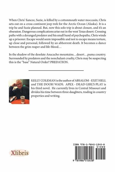 When Chris’ fiancee, Suzie, is killed by a cottonmouth water moccasin, Chris sets out on a cross continent jeep trek for the Arctic Ocean (Alaska). It is a trip he and Suzie planned. But, now this solo trip is about closure, and it’s an obsession with Chris. Dangerous complications arise out in the west Texas desert. Crossing paths with a deranged predator and his small band of psychopaths, Chris winds up a prisoner. Escape would seem impossible and not to escape means torture, up close and personal, followed by an abhorrent death. It becomes a dance between the grim reaper and life-blood… In the shadow of the desolate Anacacho mountains…desert…puma country. Surrounded by predators and the nonchalant cruelty, Chris may be suspecting this is the "base" Natural Order? PREDATION.