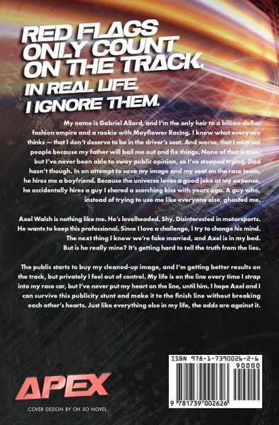 Red flags only count on the track. In real life, I ignore them. My name is Gabriel Allard, and I'm the only heir to a billion-dollar fashion empire and a rookie with Mayflower Racing. I know what everyone thinks - that I don't deserve to be in the driver's seat. And worse, that I mistreat people because my father will bail me out and fix things. None of that is true, but I've never been able to sway public opinion, so I've stopped trying. Dad hasn't though. In an attempt to save my image and my seat on the race team, he hires me a boyfriend. Because the universe loves a good joke at my expense, he accidentally hires a guy I shared a scorching kiss with years ago. A guy who, instead of trying to use me like everyone else, ghosted me. Axel Walsh is nothing like me. He's levelheaded. Shy. Disinterested in motorsports. He wants to keep this professional. Since I love a challenge, I try to change his mind. The next thing I know we're fake married, and Axel is in my bed. But is he really mine? It's getting hard to tell the truth from the lies. The public starts to buy my cleaned-up image, and I'm getting better results on the track, but privately I feel out of control. My life is on the line every time I strap into my race car, but I've never put my heart on the line, until him. I hope Axel and I can survive this publicity stunt and make it to the finish line without breaking each other's hearts. Just like everything else in my life, the odds are against it. Apex is a contemporary mm sports romance about open-wheel race car drivers. It's a fake dating, fake marriage, slightly second-chance love story set against the glitzy backdrops of Monaco, Vegas, Paris, Greece and more. Apex is a stand-alone book in the Faster series, which also includes books by Leslie McAdam and Regina Kyle.