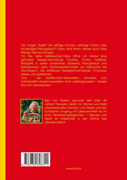 Sie mögen Äpfel? Als saftige Kuchen, sahnige Torten oder knuspriges Kleingebäck? Dann wird Ihnen dieses Buch eine Menge Genuss bringen.Für Sie, liebe Apfelkuchen-Fans, öffne ich meine lang gehütete Rezept-Sammlung: Kuchen, Torten, Aufläufe, Bratäpfel in vielen Variationen, Desserts, Kleingebäck und Mehlspeisen. Dazu Küchengeheimnisse von Nantucket bis Oberbayern, ein Bonus-Teil mit der weltbesten Bratapfelmarmelade, Chutneys, Gelee und Apfelbroten.Für Experimentierfreudige und Zutatensucher habe ich den Apfelkuchen-Baukasten erfunden zum individuellen Zusammenstellen Ihrer Lieblingszutaten - lassen Sie sich überraschen!Mein besonderes Anliegen: Low-Waste-Rezepte - Resteküche ist moderne, achtsame Küche. Ein eigenes Register zeigt Ihnen die passenden Rezepte für Ihre Resteverwertung.