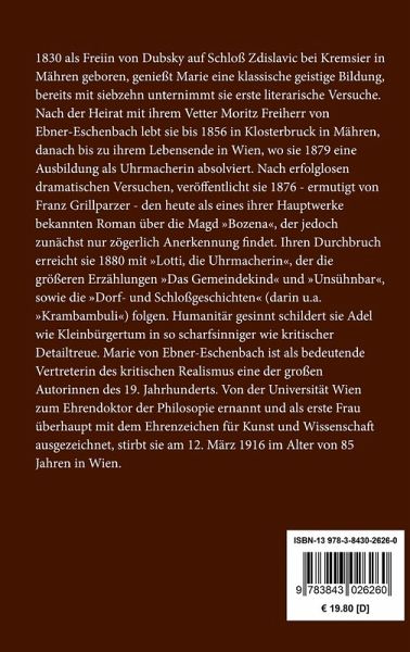 Marie von Ebner-Eschenbach: Aphorismen Erstdruck 1880. Hier nach der Ausgabe Gesammelte Schriften, Erster Band, Berlin, Verlag von Gebrüder Paetel, 1893. Vollständige Neuausgabe. Herausgegeben von Karl-Maria Guth. Berlin 2015. Umschlaggestaltung von Thomas Schultz-Overhage unter Verwendung des Bildes: Marie von Ebner-Eschenbach (Gemälde von Karl Blaas, 1873). Gesetzt aus Minion Pro, 11 pt. Über die Autorin: 1830 als Freiin von Dubsky auf Schloß Zdislavic bei Kremsier in Mähren geboren, genießt Marie eine klassische geistige Bildung, bereits mit siebzehn unternimmt sie erste literarische Versuche. Nach der Heirat mit ihrem Vetter Moritz Freiherr von Ebner-Eschenbach lebt sie bis 1856 in Klosterbruck in Mähren, danach bis zu ihrem Lebensende in Wien, wo sie 1879 eine Ausbildung als Uhrmacherin absolviert. Nach erfolglosen dramatischen Versuchen, veröffentlicht sie 1876 - ermutigt von Franz Grillparzer - den heute als eines ihrer Hauptwerke bekannten Roman über die Magd »Bozena«, der jedoch zunächst nur zögerlich Anerkennung findet. Ihren Durchbruch erreicht sie 1880 mit »Lotti, die Uhrmacherin«, der die größeren Erzählungen »Das Gemeindekind« und »Unsühnbar«, sowie die »Dorf- und Schloßgeschichten« (darin u.a. »Krambambuli«) folgen. Humanitär gesinnt schildert sie Adel wie Kleinbürgertum in so scharfsinniger wie kritischer Detailtreue. Marie von Ebner-Eschenbach ist als bedeutende Vertreterin des kritischen Realismus eine der großen Autorinnen des 19. Jahrhunderts. Von der Universität Wien zum Ehrendoktor der Philosopie ernannt und als erste Frau überhaupt mit dem Ehrenzeichen für Kunst und Wissenschaft ausgezeichnet, stirbt sie am 12. März 1916 im Alter von 85 Jahren in Wien.
