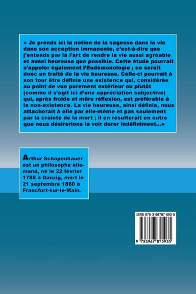 Je prends ici la notion de la sagesse dans la vie dans son acception immanente, c'est-à-dire que j'entends par là l'art de rendre la vie aussi agréable et aussi heureuse que possible. Cette étude pourrait s'appeler également l'Eudémonologie ; ce serait donc un traité de la vie heureuse. Celle-ci pourrait à son tour être définie une existence qui, considérée au point de vue purement extérieur ou plutôt (comme il s'agit ici d'une appréciation subjective) qui, après froide et mûre réflexion, est préférable à la non-existence. La vie heureuse, ainsi définie, nous attacherait à elle par elle-même et pas seulement par la crainte de la mort ; il en résulterait en outre que nous désirerions la voir durer indéfiniment...