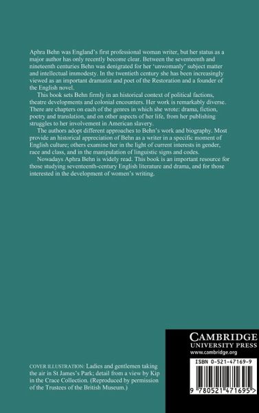 Introduction Janet Todd; Part I. Plays: 1. Sexual politics and party politics in Behn's drama, 1678-83 Sue Owen; 2. Popish plots: The Feign'd Curtizans in context Alison Shell; 3. Fiction feigning feminity: false counts and pageant kings in Aphra Behn's Popish Plot writings Ros Ballaster; 4. More for seeing than hearing: Behn and the use of theatre Dawn Lewcock; 5. The Rover and the eighteenth century Jane Spencer; Part II. Poetry: 6. Aphra Behn: poetry and masquerade Paul Salzman; 7. 'For when the act is done and finish't cleane, what should the poet doe, but shift the scene?': propaganda, professionalism and Aphra Behn Virginia Crompton; 8. Aphra Behn: the politics of translation Elizabeth Spearing; 9. 'But to the touch were soft': sex, property and the politics of the penis Jessica Munns; Part II. Fiction: 10. Who is Silvia: what is she?: feminine identity in Aphra Behn's Love-Letters between a Nobleman and his Sister Janet Todd; 11. Slave princes and lady monsters: gender and ethnic difference in the work of Aphra Behn Jacqueline Pearson; 12. Oroonoko's blackness Catherine Gallagher; 13. Confusing matters: searching the backgrounds of Oroonoko Joanna Lipking; Part IV. Biography: 14. Private jottings, public utterances: Aphra Behn's writings and her Commonplace Book Mary Ann O'Donnell; 15. New light on the background and early life of Aphra Behn Jane Jones.
