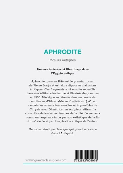 Amours torturées et libertinage dans l'Égypte antique POUR UN PUBLIC AVERTI. Aphrodite, paru en 1896, est le premier roman de Pierre Louÿs et est alors dépourvu d'allusions érotiques. Ces fragments sont ensuite recueillis dans une édition clandestine et illustrée de gravures en 1930. L'intrigue se déroule dans un cercle de courtisanes d'Alexandrie au Ier siècle av. J.-C. et raconte les amours tourmentées et impossibles de Chrysis avec Démétrios, un sculpteur attirant la convoitise de toutes les femmes de la cité. Le roman a connu un large succès de par son esthétique de la fin du XIXe siècle et par l'inspiration antique de l'auteur. Un roman érotique classique qui prend sa source dans l'Antiquité. EXTRAIT Couchée sur la poitrine, les coudes en avant, les jambes écartées et la joue dans la main, elle piquait de petits trous symétriques dans un oreiller de lin vert, avec une longue épingle d¿or. Depuis qüelle s¿était éveillée, deux heures après le milieu du jour, et toute lasse d¿avoir trop dormi, elle était restée seule sur le lit en désordre, couverte seulement d¿un côté par un vaste flot de cheveux. Cette chevelure était éclatante et profonde, douce comme une fourrure, plus longue qüune aile, souple, innombrable, animée, pleine de chaleur. Elle couvrait la moitié du dos, s¿étendait sous le ventre nu, brillait encore auprès des genoux, en boucle épaisse et arrondie. La jeune femme était enroulée dans cette toison précieuse, dont les reflets mordorés étaient presque métalliques et l¿avaient fait nommer Chrysis par les courtisanes d¿Alexandrie. À PROPOS DE L'AUTEUR Pierre Louÿs (1870-1925), né à Gand et mort à Paris, est un poète et romancier français, également illustre sous les noms de plume Chrysis, Peter Lewys et Pibrac. Il fonde en 1891 la revue littéraire La Conque, où sont publiées les oeuvres d'auteurs parnassiens et symbolistes, parmi lesquels Mallarmé, Moréas, Verlaine ou encore Leconte de Lisle. Outre Aphrodite, La Femme et le pantin ou encore Les Aventures du Roi Pausole, Pierre Louÿs a rédigé de nombreux romans érotiques, peu à peu révélés à titre posthume. À PROPOS DE LA COLLECTION Retrouvez les plus grands noms de la littérature érotique dans notre collection Grands classiques érotiques. Autrefois poussés à la clandestinité et relégués dans « l'Enfer des bibliothèques », les auteurs de ces ¿uvres incontournables du genre sont aujourd'hui reconnus mondialement. Du Marquis de Sade à Alphonse Momas et ses multiples pseudonymes, en passant par le lyrique Alfred de Musset ou la féministe Renée Dunan, les Grands classiques érotiques proposent un catalogue complet et varié qui contentera tant les novices que les connaisseurs.
