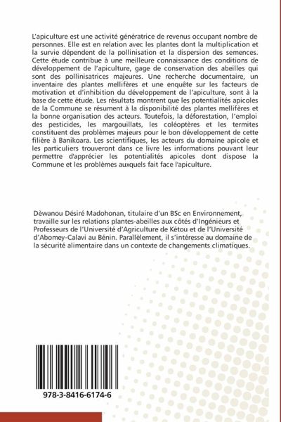 L'apiculture est une activité génératrice de revenus occupant nombre de personnes. Elle est en relation avec les plantes dont la multiplication et la survie dépendent de la pollinisation et la dispersion des semences. Cette étude contribue à une meilleure connaissance des conditions de développement de l'apiculture, gage de conservation des abeilles qui sont des pollinisatrices majeures. Une recherche documentaire, un inventaire des plantes mellifères et une enquête sur les facteurs de motivation et d'inhibition du développement de l'apiculture, sont à la base de cette étude. Les résultats montrent que les potentialités apicoles de la Commune se résument à la disponibilité des plantes mellifères et la bonne organisation des acteurs. Toutefois, la déforestation, l'emploi des pesticides, les margouillats, les coléoptères et les termites constituent des problèmes majeurs pour le bon développement de cette filière à Banikoara. Les scientifiques, les acteurs du domaine apicole et les particuliers trouveront dans ce livre les informations pouvant leur permettre d'apprécier les potentialités apicoles dont dispose la Commune et les problèmes auxquels fait face l'apiculture.
