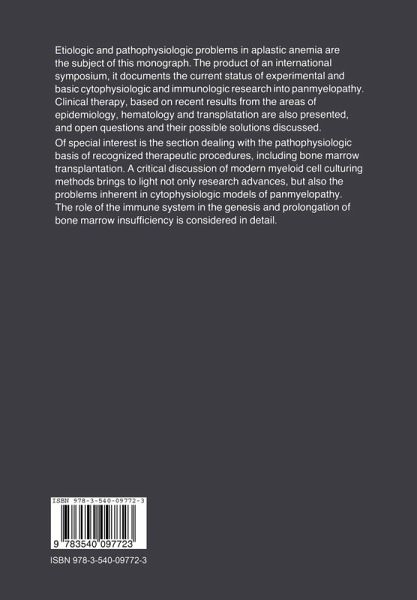 1 Introduction.- 2 Clinical Observations in Aplastic Anemia.- 2.1 Clinical Features of Aplastic Anaemia.- 2.2 Histology of Bone Marrow Failure, a Follow-up Study in Aplastic Anaemia.- 2.3 Epidemiology and Aetiology of Aplastic Anemia.- 2.4 The Role of Viral Infections in Aplastic Anemia.- 2.5 Aplastic Anemia Terminating in Leukemia.- 2.6 General Discussion.- 3 Kinetics and Control of Hemopoietic Stem Cells.- 3.1 Aplastic Anemia - a Stem Cell Disorder?.- 3.2 Mechanism of Damage to the Stem Cell Population.- 3.3 Congenital and Induced Defects in Haemopoietic Environments, Stem Cell Proliferation and Differentiation.- 3.4 Independent Requirements for Early and Late Stages of Erythropoiesis.- 3.5 Estimation of the Pluripotential Stem Cells in Bone Marrow After Hydroxyurea.- 3.6 CFU-C and Colony Stimulating Activity in Human Aplastic Anemia.- 3.7 Granulocytic and Erythroid Progenitor Cells in Recovering Aplastic Anemia.- 3.8 High BPA in Aplastic Anemia, a Possible Indicator of Immune Pathogenesis.- 3.9 Early and Late Effects of Adjuvant Chemotherapy (Adriamycin/Cyclophos-phamide) on the Human Granulopoiesis.- 3.10 General Discussion.- 4 The Rationale of Therapeutic Aproaches in Aplastic Anemia.- 4.1 Stimulation of Hemopoiesis in Aplastic Anemia by Hormones and Other Agents.- 4.2 Evolution of 352 Adult Patients Treated with Androgens: Short and Long Term Results of a Prospective Study.- 4.3 Insight into the Pathophysiology of Aplastic Anemia Provided Through the Results of Marrow Transplantation.- 4.4 Pathogenesis of Severe Aplastic Anemia: Inferences from Therapeutic Trials.- 4.5 Infusion of Fetal Liver Cells in Aplastic Anemia.- 4.6 Antilymphocyte Globulin Treatment in Severe Aplastic Anemia - Comparison with Bone Marrow Transplantation. Report of 60 Cases.- 4.7Aplastic Anemia: Evidence of Immuno-Pathomechanisms and Successful Treatment with Absorbed ATG.- 4.8 The Role of Haplo-identical Bone Marrow Transfusion in ALG Treated Patients with Severe Aplastic Anemia (SAA).- 4.9 The Effect of Anthymocyte Globulin on Abnormal Lymphocyte Transformation in Patients with Aplastic Anemia.- 4.10 Recovery from Aplastic Anemia Following Therapy with Anti-thymocyte Globulin.- 5 Problems of an Immunological Pathogenesis in Aplastic Anemia.- 5.1 Some Possible Mechanisms Leading to Autoimmune Destruction of Bone Marrow Cells.- 5.2 Immunologic Function in Aplastic Anemia.- 5.3 Serum Inhibitors of Granulocyte CFU-C in Aplastic Anemia.- 5.4 Serum Inhibitors in Aplastic Anaemia.- 5.5 Aplastic Anemia After Bone Marrow Transplantation for Severe Combined Immunodeficiency.- 5.6 The Contribution of in Vitro Cultures to the Elucidation of the Pathogenesis of Aplastic Anaemia.- 5.7 Interpretations of Culture Data in Aplastic Anemia: Evidence for a Suppressor Cell Involvement.- 5.8 Co-culture Studies in Transfused and Untransfused Patients with Aplastic Anemia.- 5.9 General Discussion.- 6 Final Discussion.- 7 Summing-up.