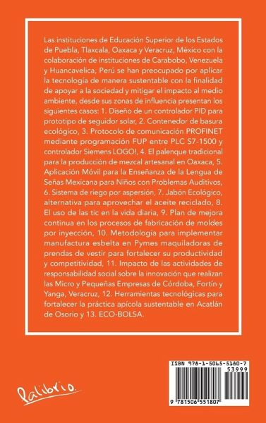 Las instituciones de Educación Superior de los Estados de Puebla, Tlaxcala, Oaxaca y Veracruz, México con la colaboración de instituciones de Carabobo, Venezuela y Huancavelica, Perú se han preocupado por aplicar la tecnología de manera sustentable con la finalidad de apoyar a la sociedad y mitigar el impacto al medio ambiente, desde sus zonas de influencia presentan los siguientes casos: 1. Diseño de un controlador PID para prototipo de seguidor solar, 2. Contenedor de basura ecológico, 3. Protocolo de comunicación PROFINET mediante programación FUP entre PLC S7-1500 y controlador Siemens LOGO!, 4. El palenque tradicional para la producción de mezcal artesanal en Oaxaca, 5. Aplicación Móvil para la Enseñanza de la Lengua de Señas Mexicana para Niños con Problemas Auditivos, 6. Sistema de riego por aspersión, 7. Jabón Ecológico, alternativa para aprovechar el aceite reciclado, 8. El uso de las tic en la vida diaria, 9. Plan de mejora continua en los procesos de fabricación de moldes por inyección, 10. Metodología para implementar manufactura esbelta en Pymes maquiladoras de prendas de vestir para fortalecer su productividad y competitividad, 11. Impacto de las actividades de responsabilidad social sobre la innovación que realizan las Micro y Pequeñas Empresas de Córdoba, Fortín y Yanga, Veracruz, 12. Herramientas tecnológicas para fortalecer la práctica apícola sustentable en Acatlán de Osorio y 13. ECO-BOLSA.