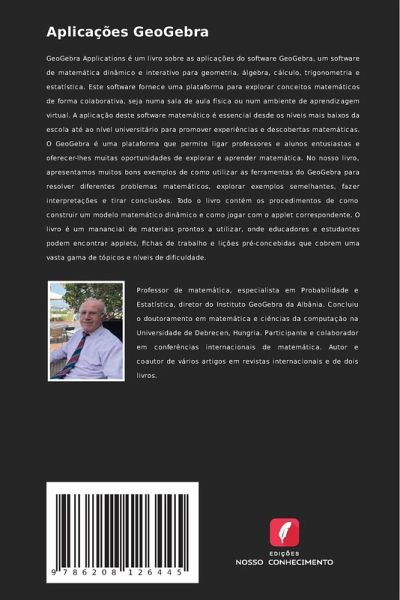 GeoGebra Applications é um livro sobre as aplicações do software GeoGebra, um software de matemática dinâmico e interativo para geometria, álgebra, cálculo, trigonometria e estatística. Este software fornece uma plataforma para explorar conceitos matemáticos de forma colaborativa, seja numa sala de aula física ou num ambiente de aprendizagem virtual. A aplicação deste software matemático é essencial desde os níveis mais baixos da escola até ao nível universitário para promover experiências e descobertas matemáticas. O GeoGebra é uma plataforma que permite ligar professores e alunos entusiastas e oferecer-lhes muitas oportunidades de explorar e aprender matemática. No nosso livro, apresentamos muitos bons exemplos de como utilizar as ferramentas do GeoGebra para resolver diferentes problemas matemáticos, explorar exemplos semelhantes, fazer interpretações e tirar conclusões. Todo o livro contém os procedimentos de como construir um modelo matemático dinâmico e como jogar com o applet correspondente. O livro é um manancial de materiais prontos a utilizar, onde educadores e estudantes podem encontrar applets, fichas de trabalho e lições pré-concebidas que cobrem uma vasta gama de tópicos e níveis de dificuldade.