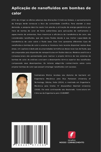 A fim de mitigar os efeitos adversos das Alterações Climáticas Globais, o aproveitamento da Energia Verde tornou-se o foco da comunidade científica. Para atender a essa demanda, a pesquisa descrita neste livro aborda a utilização de energia geotérmica por meio de bomba de calor de fonte subterrânea para aplicações de resfriamento e aquecimento de ambientes. Para maximizar a eficiência da transferência de calor, são considerados nanofluidos, que são novos fluidos devido à sua melhor capacidade de transferência de calor sobre o fluido base. Este livro apresenta diferentes tipos de nanofluidos e bombas de calor e analisa a literatura mais recente disponível nestas duas áreas. Um capítulo é dedicado às propriedades termofísicas desse novo tipo de fluido, que são preparados pela dispersão de nanopartículas em fluidos básicos. Modelos analíticos e computacionais são apresentados para realizar o projeto térmico de tais sistemas de bombas de calor. As análises concluem o desempenho térmico superior dos nanofluidos comparando seus desempenhos. Os leitores adquirirão conhecimento sobre como projetar bombas de calor que possam empregar nanofluidos com sucesso.