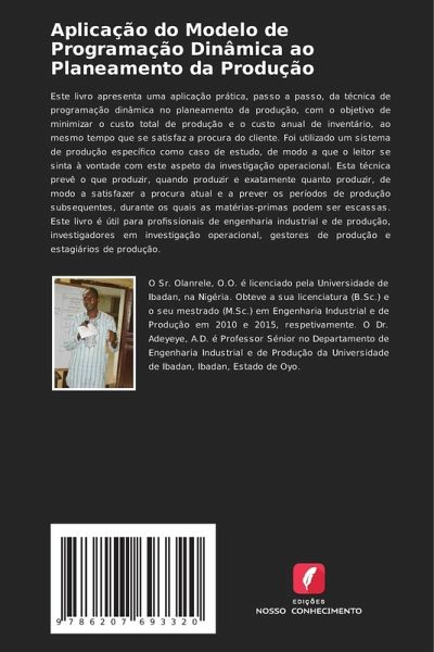 Este livro apresenta uma aplicação prática, passo a passo, da técnica de programação dinâmica no planeamento da produção, com o objetivo de minimizar o custo total de produção e o custo anual de inventário, ao mesmo tempo que se satisfaz a procura do cliente. Foi utilizado um sistema de produção específico como caso de estudo, de modo a que o leitor se sinta à vontade com este aspeto da investigação operacional. Esta técnica prevê o que produzir, quando produzir e exatamente quanto produzir, de modo a satisfazer a procura atual e a prever os períodos de produção subsequentes, durante os quais as matérias-primas podem ser escassas. Este livro é útil para profissionais de engenharia industrial e de produção, investigadores em investigação operacional, gestores de produção e estagiários de produção.
