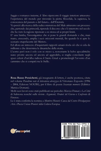 Saggio e romanzo insieme, il libro ripercorre il viaggio interiore attraverso l'esperienza del mondo per rinvenire la pietra filosofale, la sapienza, la conoscenza del passato e del futuro...dell'Eternità. Va perciò alla ricerca della radice misteriosa del Male attraverso un processo che, partendo dai primordi, riprende il discorso che s'è interrotto nel secolo che ha visto la ragione ripensare a se stessa ed ai propri limiti. E' una bimba, l'investigatrice che si pone le grandi domande e che, man mano, crescendo, amplia i suoi orizzonti mentali, fin quando le si apre lo scenario stupefacente del Mistero. Ed allora un intreccio d'inquietanti rapporti umani rivela ciò che si cela da millenni e che determina le dinamiche della storia. L'uomo però non è solo con se stesso e, nonostante le belve apocalittiche siano pronte ancora ed ancora ad aggredirlo, si staglia consolante negli spazi celesti d'un'alba radiosa il Santo Graal a promettergli l'avvento d'un cammino che si compirà tra le Stelle.