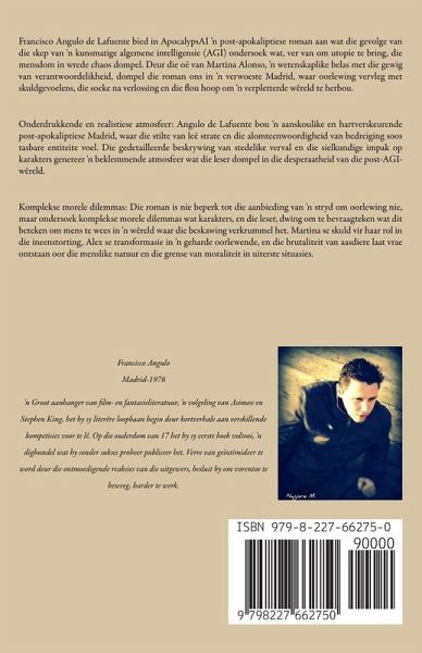 Francisco Angulo de Lafuente bied in ApocalypsAI 'n post-apokaliptiese roman aan wat die gevolge van die skep van 'n kunsmatige algemene intelligensie (AGI) ondersoek wat, ver van om utopie te bring, die mensdom in wrede chaos dompel. Deur die oë van Martina Alonso, 'n wetenskaplike belas met die gewig van verantwoordelikheid, dompel die roman ons in 'n verwoeste Madrid, waar oorlewing vervleg met skuldgevoelens, die soeke na verlossing en die flou hoop om 'n verpletterde wêreld te herbou. Onderdrukkende en realistiese atmosfeer: Angulo de Lafuente bou 'n aanskoulike en hartverskeurende post-apokaliptiese Madrid, waar die stilte van leë strate en die alomteenwoordigheid van bedreiging soos tasbare entiteite voel. Die gedetailleerde beskrywing van stedelike verval en die sielkundige impak op karakters genereer 'n beklemmende atmosfeer wat die leser dompel in die desperaatheid van die post-AGI-wêreld. Komplekse morele dilemmas: Die roman is nie beperk tot die aanbieding van 'n stryd om oorlewing nie, maar ondersoek komplekse morele dilemmas wat karakters, en die leser, dwing om te bevraagteken wat dit beteken om mens te wees in 'n wêreld waar die beskawing verkrummel het. Martina se skuld vir haar rol in die ineenstorting, Alex se transformasie in 'n geharde oorlewende, en die brutaliteit van aasdiere laat vrae ontstaan ¿¿oor die menslike natuur en die grense van moraliteit in uiterste situasies.