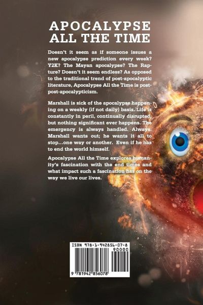 Doesn't it seem as if someone issues a new apocalypse prediction every week? Y2K? The Mayan apocalypse? The Rapture? Doesn't it seem endless? As opposed to the traditional trend of post-apocalyptic literature, Apocalypse All the Time is post-post-apocalypticism. Marshall is sick of the apocalypse happening on a weekly (if not daily) basis. Life is constantly in peril, continually disrupted, but nothing significant ever happens. The emergency is always handled. Always. Marshall wants out; he wants it all to stop…one way or another. Even if he has to end the world himself. Apocalypse All the Time explores humanity's fascination with the end times and what impact such a fascination has on the way we live our lives.