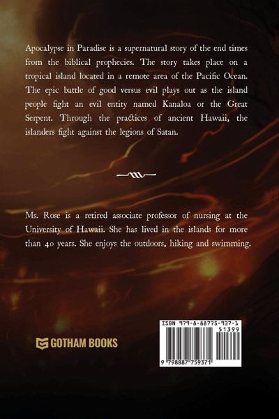 Apocalypse in Paradise is a supernatural story of the end times from the biblical prophecies. The story takes place on a tropical island located in a remote area of the Pacific Ocean. The epic battle of good versus evil plays out as the island people fight an evil entity named Kanaloa or the Great Serpent. Through the practices of ancient Hawaii, the islanders fight against the legions of Satan.