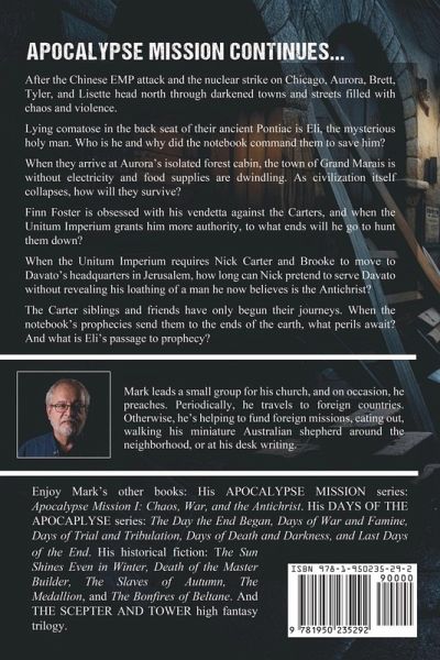 After the Chinese EMP attack and the nuclear strike on Chicago, Aurora, Brett, Tyler, and Lisette head north through darkened towns and streets filled with chaos and violence. Lying comatose in the back seat of their ancient Pontiac is Eli, the mysterious holy man. Who is he and why did the notebook command them to save him? When they arrive at Aurora's isolated forest cabin, the town of Grand Marais is without electricity and food supplies are dwindling. As civilization itself collapses, how will they survive? Finn Foster is obsessed with his vendetta against the Carters, and when the Unitum Imperium grants him more authority. To what ends will he go to hunt them down? When the Unitum Imperium requires Nick Carter and Brooke to move to Davato's headquarters in Jerusalem, how long can Nick pretend to serve Davato without revealing his loathing of a man he now believes is the Antichrist? The Carter siblings and friends have only begun their journeys. When the notebook's prophecies send them to the ends of the earth, what perils await? And what is Eli's passage to prophecy?