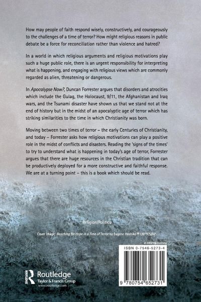 In Apocalypse Now?, Duncan Forrester argues that disorders and atrocities including the Gulag, the Holocaust, 9/11, the Afghanistan and Iraq wars, and the Tsunami disaster have shown us that we stand in the midst of an apocalyptic age of terror with striking similarities to the time in which Christianity was born. He asks how religious ideas can play a positive role in the midst of conflicts and disasters and argues that there are huge resources in the Christian tradition that can be productively deployed for a constructive and faithful response.