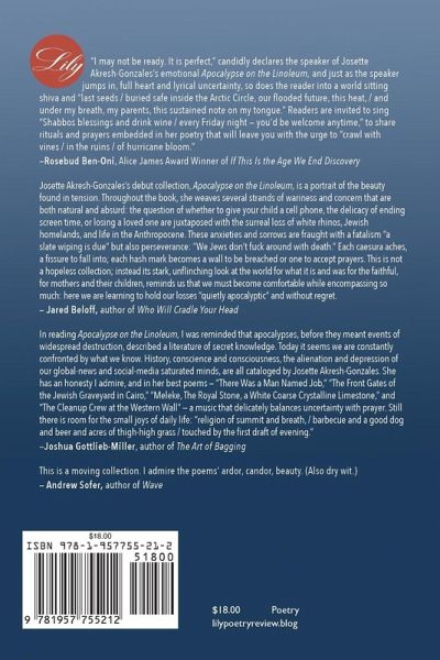 Apocalypse on the Linoleum grapples with big stuff - religious and cultural identity, climate change, motherhood, death, history - with an unflinching eye and a paradoxical, active hope. Gutsy, raw, and bold, the poems often use a narrative frame and speak through a Jewish lens to encounter emotional issues. From the intimate details of childbirth to assisted suicide to protestors losing blood to alternate names of God, this collection exposes our relationship to the earth, our place in the universe.