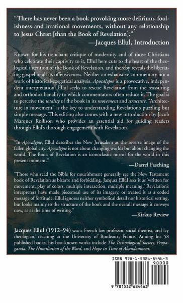 ""There has never been a book provoking more delirium, foolishness and irrational movements, without any relationship to Jesus Christ [than the Book of Revelation]."" - Jacques Ellul, Introduction Known for his trenchant critique of modernity and of those Christians who celebrate their captivity to it, Ellul here cuts to the heart of the theological intention of the Book of Revelation, and thereby reveals the liberating gospel in all its offensiveness. Neither an exhaustive commentary nor a work of historical-exegetical analysis, Apocalypse is a provocative, independent interpretation. Ellul seeks to rescue Revelation from the reassuring and orthodox banality to which commentators often reduce it. The goal is to perceive the totality of the book in its movement and structure. ""Architecture in movement"" is the key to understanding Revelation's puzzling but simple message. This edition also comes with a new foreword by Jacob Marques Rollison who provides an essential aid for guiding readers through Ellul's thorough engagement with Revelation.