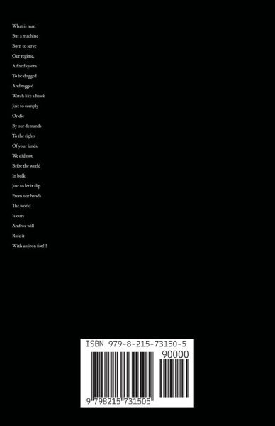 What is man But a machine Born to serve Our regime, A fixed quota To be dogged And tagged Watch like a hawk Just to comply Or die By our demands To the rights Of your lands, We did not Bribe the world In bulk Just to let it slip From our hands The world Is ours And we will Rule it With an iron fist!!!