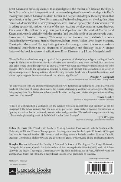 Ernst Kasemann famously claimed that apocalyptic is the mother of Christian theology. J. Louis Martyn's radical interpretation of the overarching significance of apocalyptic in Paul's theology has pushed Kasemann's claim further and deeper. Still, despite the recognition that apocalyptic is at the core of New Testament and Pauline theology, modern theology has often dismissed, domesticated, or demythologized early Christian apocalyptic. A renewed interest in taking apocalyptic seriously is one of the most exciting developments in recent theology. The essays in this volume, taking their point of departure from the work of Martyn (and Kasemann), wrestle critically with the promise (and possible peril) of the apocalyptic transformation of Christian theology. With original contributions from established scholars (including Beverly Gaventa, Stanley Hauerwas, Robert Jenson, Walter Lowe, Joseph Mangina, Christopher Morse, and Fleming Rutledge) as well as younger voices, this volume makes a substantial contribution to the discussion of apocalyptic and theology today. A unique feature of the book is a personal reflection on Ernst Kasemann by J. Louis Martyn himself.