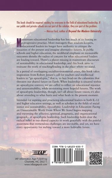 Mainstream educational leadership has lost much of its footing as a progressive practice. More managers than wisdom-keepers, educational leaders no longer have authority to critique the toxicities of the present and imagine alternative futures. In public schools and higher education, the neoliberal emphasis on measurable outcomes shrinks the radius of concern for what educational leaders are leading toward. There's a planet missing in mainstream discourses of sustainability in educational leadership, and this book aims to resituate the work of teaching/leading in the place where we stand. In a period of overlapping social/environmental crises, this book takes inspiration from Robert Jensen's call for teachers and intellectual leaders to "go apocalyptic", i.e., to face head-on the calamities that threaten our shared future on Earth. When leadership is situated within an apocalyptic context, we are called to reflect on educational injustice and unsustainability, while envisioning more hopeful futures. The work of apocalyptic leadership, though, isn't all about future vision; it's also about attending to what hurts and what heals in the present moment. Intended for aspiring and practicing educational leaders in both K-12 and higher education settings, as well as scholars in the fields of social justice and sustainability, this book begins mapping and traversing the affective, spiritual, pragmatic, and organizational geography of apocalyptic leadership. Such leadership holds dear the radical belief in our shared capacity to work gracefully with the painful awareness that tremendous challenges are inevitable, and yet, we have every opportunity for inching toward a more habitable future.