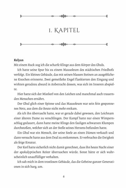 Kelyan ist einer der vier apokalyptischen Reiter, einst dazu bestimmt, das Grauen des Kriegs über die Menschen zu bringen. Aber die Welt hat sich verändert. Ein neues, göttliches Spiel der Macht hat begonnen und nun durchstreift er die Dunkelheit auf der Jagd nach den Kreaturen der Nacht. Bis zu jenem Tag, der alles verändert. Als er IHR begegnet ...