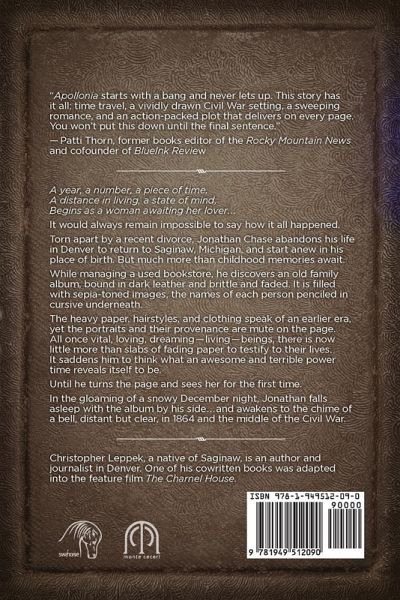 Apollonia is a story that has it all: time travel, a vividly drawn Civil War setting, a sweeping romance, and an action-packed plot that delivers on every page. A year, a number, a piece of time, A distance in living, a state of mind, Begins as a woman awaiting her lover . . . It was and would always remain impossible to say how it all happened. Torn apart by a recent divorce, guitar-strumming everyman Jonathan Chase abandons his life in Denver to return to Saginaw, Michigan, and start anew in his place of birth. But much more than childhood memories await. While managing a used bookstore, he discovers an old family album, bound in dark leather and brittle and faded. It is filled with sepia-toned images, the names of each person penciled in cursive underneath. Although not the usual inventory he stocks on the shelves, Jonathan can't seem to part with it. The heavy paper, hairstyles, and clothing speak of an earlier era, yet the portraits and their provenance are mute on the page. All once vital, thinking, loving, hating, hoping, dreaming - living - beings, there is now little more than slabs of fading paper to testify to their lives. It saddens him to think what an awesome and terrible power time reveals itself to be. Until he turns the page and sees her for the first time. In the gloaming of a snowy December night, Jonathan falls asleep with the album and his cat Pluto by his side . . . and awakens to the chime of a bell, distant but clear, in 1864 and the middle of the Civil War. Although his journey of romance, war, intrigue, mystery, and a touch of the supernatural will lengthen and deepen far beyond what he ever would have imagined or even thought possible, the why was the easiest question of all. Apollonia was the why.