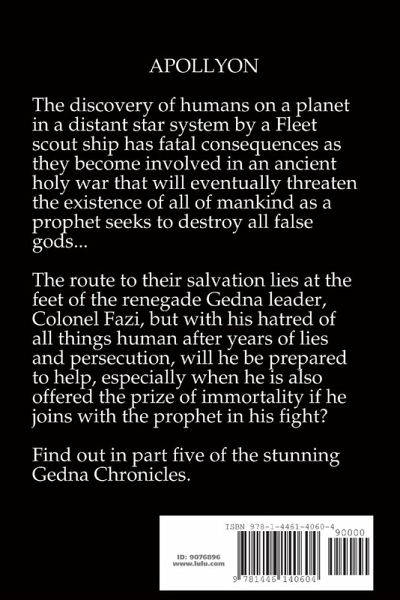 The discovery of humans on a planet in a distant star system by a Fleet scout ship has fatal consequences as they become involved in an ancient holy war that will eventually threaten the existence of all of mankind as a prophet seeks to destroy all false gods... The route to their salvation lies at the feet of the renegade Gedna leader, Colonel Fazi, but with his hatred of all things human after years of lies and persecution, will he be prepared to help, especially when he is also offered the prize of immortality if he joins with the prophet in his fight? Find out in part five of the stunning Gedna Chronicles.