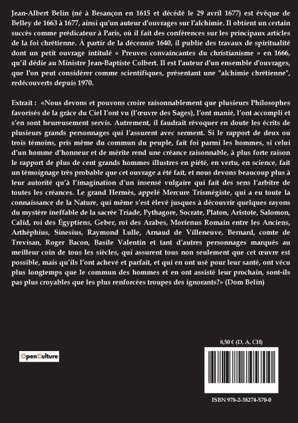 Jean-Albert Belin (né à Besançon en 1615 et décédé le 29 avril 1677) est évêque de Belley de 1663 à 1677, ainsi qu'un auteur d'ouvrages sur l'alchimie. Il obtient un certain succès comme prédicateur à Paris, où il fait des conférences sur les principaux articles de la foi chrétienne. À partir de la décennie 1640, il publie des travaux de spiritualité dont un petit ouvrage intitulé « Preuves convaincantes du christianisme » en 1666, qüil dédie au Ministre Jean-Baptiste Colbert. Il est l'auteur d'un ensemble d'ouvrages, que l'on peut considérer comme scientifiques, présentant une "alchimie chrétienne", redécouverts depuis 1970. Extrait : «Nous devons et pouvons croire raisonnablement que plusieurs Philosophes favorisés de la grâce du Ciel l¿ont vu (l¿¿uvre des Sages), l¿ont manié, l¿ont accompli et s¿en sont heureusement servis. Autrement, il faudrait révoquer en doute les écrits de plusieurs grands personnages qui l¿assurent avec serment. Si le rapport de deux ou trois témoins, pris même du commun du peuple, fait foi parmi les hommes, si celui d¿un homme d¿honneur et de mérite rend une créance raisonnable, à plus forte raison le rapport de plus de cent grands hommes illustres en piété, en vertu, en science, fait un témoignage très probable que cet ouvrage a été fait, et nous devons beaucoup plus à leur autorité qüà l¿imagination d¿un insensé vulgaire qui fait des sens l¿arbitre de toutes les créances. Le grand Hermès, appelé Mercure Trismégiste, qui a eu toute la connaissance de la Nature, qui même s¿est élevé jusques à découvrir quelques rayons du mystère ineffable de la sacrée Triade, Pythagore, Socrate, Platon, Aristote, Salomon, Calid, roi des Égyptiens, Geber, roi des Arabes, Morienus Romain entre les Anciens, Arthéphius, Sinesius, Raymond Lulle, Arnaud de Villeneuve, Bernard, comte de Trevisan, Roger Bacon, Basile Valentin et tant d¿autres personnages marqués au meilleur coin de tous les siècles, qui assurent tous non seulement que cet ¿uvre est possible, mais qüils l¿ont achevé et parfait, et qui en ont usé pour leur santé, ont vécu plus longtemps que le commun des hommes et en ont assisté leur prochain, sont-ils pas plus croyables que les plus renforcées troupes des ignorants?» (Dom Belin)