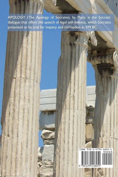 APOLOGY (The Apology of Socrates), by Plato, is the Socratic dialogue that presents the speech of legal self-defence, which Socrates presented at his trial for impiety and corruption, in 399 BC.
