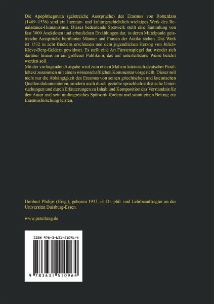 Mit der vorliegenden Ausgabe wird zum ersten Mal ein lateinisch-deutscher Paralleltext zusammen mit einem wissenschaftlichen Kommentar vorgestellt. Dieser soll nicht nur die Abhängigkeit des Erasmus von seinen griechischen und lateinischen Quellen dokumentieren, sondern auch durch gezielte sprachlich-stilistische Untersuchungen und durch Erläuterungen zu Inhalt und Komposition das Verständnis für den Autor und sein umfangreiches Spätwerk fördern und somit einen Beitrag zur Erasmusforschung leisten.
