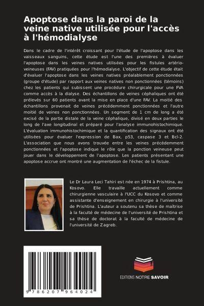 Dans le cadre de l'intérêt croissant pour l'étude de l'apoptose dans les vaisseaux sanguins, cette étude est l'une des premières à évaluer l'apoptose dans les veines natives utilisées pour les fistules artério-veineuses (FAV) pratiquées pour l'hémodialyse. L'objectif de cette étude était d'évaluer l'apoptose dans les veines natives préalablement ponctionnées (groupe d'étude) par rapport aux veines natives non ponctionnées (témoins) chez les patients qui subissent une procédure chirurgicale pour une FVA comme accès à la dialyse. Des échantillons de veines céphaliques ont été prélevés sur 60 patients avant la mise en place d'une FAV. La moitié des échantillons provenait de veines précédemment ponctionnées et l'autre moitié de veines non ponctionnées. Un segment de 1 cm de long a été excisé de la partie distale de la veine céphalique, divisé en deux parties le long de l'axe longitudinal et préparé pour l'analyse immunohistochimique. L'évaluation immunohistochimique et la quantification des signaux ont été utilisées pour évaluer l'expression de Bax, p53, caspase 3 et Bcl-2. L'association que nous avons trouvée entre les veines précédemment ponctionnées et l'apoptose indique le rôle que la ponction veineuse peut jouer dans le développement de l'apoptose. Les patients présentant une apoptose accrue ont montré une augmentation de l'échec de la fistule.
