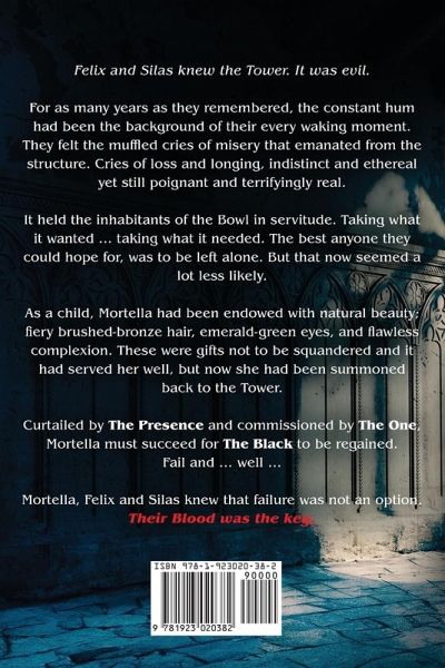 Felix and Silas knew the Tower. It was evil. For as many years as they remembered, the constant hum had been the background of their every waking moment. They felt the muffled cries of misery that emanated from the structure. Cries of loss and longing, indistinct and ethereal yet still poignant and terrifyingly real. It held the inhabitants of the Bowl in servitude. Taking what it wanted ... taking what it needed. The best anyone they could hope for, was to be left alone. But that now seemed a lot less likely. As a child, Mortella had been endowed with natural beauty; fiery brushed-bronze hair, emerald-green eyes, and flawless complexion. These were gifts not to be squandered and it had served her well, but now she had been summoned back to the Tower. Curtailed by The Presence and commissioned by The One, Mortella must succeed for The Black to be regained. Fail and ... well ... Mortella, Felix and Silas knew that failure was not an option. Their Blood was the key.