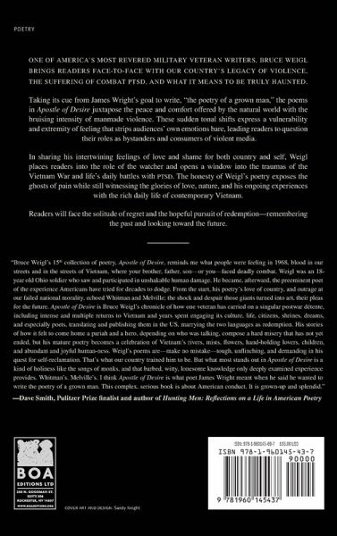 "Two-time Pulitzer Prize finalist and one of America's most revered military veteran writers, Bruce Weigl brings readers face-to-face with our country's legacy of violence, the suffering of combat PTSD, and what it means to be truly haunted. Taking its cue from James Wright's goal to write, "the poetry of a grown man," the poems in Apostle of Desire juxtapose the peace and comfort offered by the natural world with the bruising intensity of manmade violence. These sudden tonal shifts express a vulnerability and extremity of feeling that strips audiences' own emotions bare, leading readers to question their roles as bystanders and consumers of violent media. In sharing his intertwining feelings of love and shame for both country and self, Weigl places readers into the role of the watcher and opens a window into the traumas of the Vietnam War and life's daily battles with PTSD. The honesty of Weigl's poetry exposes the ghosts of pain while still witnessing the glories of love, nature, and his ongoing experiences with the rich daily life of contemporary Vietnam. Readers will face the solitude of regret and the hopeful pursuit of redemption--remembering the past and looking toward the future"--