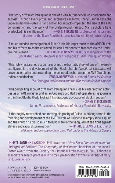 William Paul Quinn's untold story is a missing piece of American history. His deep but little-known involvement with the Underground Railroad is one of the most fascinating subplots of a remarkable life. More than any other prelate of the African Methodist Episcopal Church, or AME Church, Quinn (1788-1873) guided the faithful throughout the perilous pre-Civil War years, sanctioning escape from slavery while avoiding suspicion and, by all appearances, upholding the law. Quinn helped his followers navigate the hardships of slavery, as well as the demands of freedom in the post-Civil War world. Apostle of Liberation illuminates Quinn's significance, demonstrating why his life and courageous efforts deserve more attention-and more appreciation. It also explores, in depth and for the first time, the eight and a half years Quinn spent in New York City. It was during this time that Quinn experienced the major conflict of his life with AME founder Bishop Richard Allen over Quinn's independent activities in New York. Much to Bishop Allen's frustration, Quinn-one of the AME Church's "Four Horsemen"along with Allen-associated with ministers of other denominations, collaborated with the city's African American civic leaders, rescued freedom seekers, and operated beyond Allen's reach. Quinn later established a 150-member independent church in the city, earning Allen's wrath and a five-year exile from the church. This remarkable missionary's life embodies the struggles and challenges that shaped the lives of nineteenth-century Black leaders, and those who followed them. Apostle of Liberation explores the historical figure as well as the man of God-his spiritual gifts, his character and uniqueness, as well as his many strengths and failings. The book carefully lays out his trials and triumphs, and the magnitude of his accomplishments in the face of legally sanctioned national opposition, denominational fights and schisms, and devastating Supreme Court decisions. Combining AME Church history, the story of the Underground Railroad, the origins of African American educational efforts, and inspiring anecdotes of westward migration and community engagement, Apostle of Liberation offers an original and distinctive contribution to American religious history.