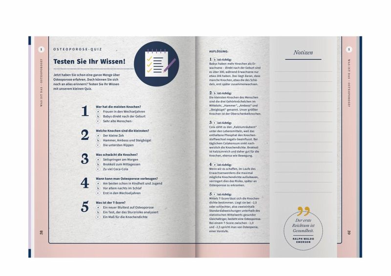 Dass etwas nicht stimmt, haben Sie sicher schon länger geahnt. Und nun steht die Diagnose fest: Sie haben Osteoporose. Doch was bedeutet das nun für Ihren Alltag? Sicher haben Sie jetzt viele Fragen. Unser Ratgeber begleitet Sie informativ durch die ersten 100 Tage. Sie lernen die Diagnose Osteoporose zu verstehen, erfahren, was in Ihrem Körper geschieht und warum Sie krank geworden sind. Sie bekommen aber auch viele Tipps und Anregungen, was Sie selbst tun können, um den Abbau der Knochendichte zu verlangsamen und die Sturzgefahr zu minimieren.
