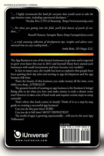 Enjoy Life, Make Money, and Live Your Dreams! The App Business is one of the hottest businesses to get into and is expected to grow even faster this year in 2013 and beyond! Many have started such businesses with small investments and have become very wealthy! In fact in many cases, the wealth has been so explosive that people have been quitting their day jobs and turning to app development and the app business full time. That's the beauty of this business; you make money all the time, even while you sleep...LITERALLY! The greatest benefit of running an app business is the freedom it brings! Being able to do what you love and make money is truly a dream come true! However it takes a lot of hard work and requires certain steps to setup correctly! That's where this book comes in handy! Think of it as a step-by-step guide to creating a successful app business! Can you do this part time? SURE! Can you do it full time? MOST DEFINITELY! The world of apps is growing exponentially...will you be the next App Trillionaire?