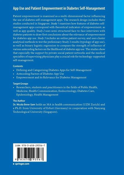 Patient empowerment is examined as a multi-dimensional factor influencing the use of diabetes self-management apps. The research design includes three studies conducted in Singapore. Study 1 examines how features of diabetes self-management apps correspond with theoretical indicators of empowerment, as well as app quality. Study 2 uses semi-structured face-to-face interviews with diabetes patients to draw first conclusions about the relevance of empowerment for diabetes app use. Study 3 includes an online patient survey, and uses cluster analytical methods to test the preliminary Study 2 results (typology of app use), as well as binary logistic regression to compare the strength of influence of various anteceding factors on the likelihood of diabetes app use. The studies show that especially the support by private social patient networks and the medical specialties of supervising physicians play a crucial role for technology-supported self-management.