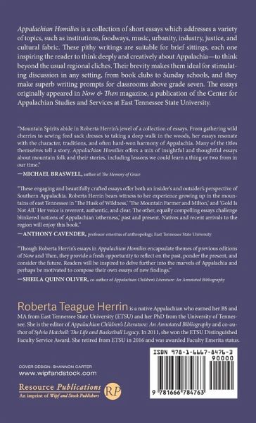 Appalachian Homilies is a collection of short essays which addresses a variety of topics, such as institutions, foodways, music, urbanity, industry, justice, and cultural fabric. These pithy writings are suitable for brief sittings, each one inspiring the reader to think deeply and creatively about Appalachia--to think beyond the usual regional cliches. Their brevity makes them ideal for stimulating discussion in any setting, from book clubs to Sunday schools, and they make superb writing prompts for classrooms above grade seven. The essays originally appeared in Now & Then magazine, a publication of the Center for Appalachian Studies and Services at East Tennessee State University.