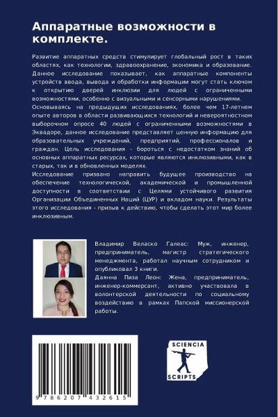 Razwitie apparatnyh sredstw stimuliruet global'nyj rost w takih oblastqh, kak tehnologii, zdrawoohranenie, äkonomika i obrazowanie. Dannoe issledowanie pokazywaet, kak apparatnye komponenty ustrojstw wwoda, wywoda i obrabotki informacii mogut stat' klüchom k otkrytiü dwerej inklüzii dlq lüdej s ogranichennymi wozmozhnostqmi, osobenno s wizual'nymi i sensornymi narusheniqmi.Osnowywaqs' na predyduschih issledowaniqh, bolee chem 17-letnem opyte awtorow w oblasti razwiwaüschihsq tehnologij i neweroqtnostnom wyborochnom oprose 40 lüdej s ogranichennymi wozmozhnostqmi w Jekwadore, dannoe issledowanie predstawlqet cennuü informaciü dlq obrazowatel'nyh uchrezhdenij, predpriqtij, professionalow i grazhdan. Cel' issledowaniq - borot'sq s nedostatkom znanij ob osnownyh apparatnyh resursah, kotorye qwlqütsq inklüziwnymi, kak w staryh, tak i w obnowlennyh modelqh.Issledowanie prizwano naprawit' buduschee proizwodstwo na obespechenie tehnologicheskoj, akademicheskoj i promyshlennoj dostupnosti w sootwetstwii s Celqmi ustojchiwogo razwitiq Organizacii Ob#edinennyh Nacij (CUR) i wkladom nauki. Rezul'taty ätogo issledowaniq - prizyw k dejstwiü, chtoby sdelat' ätot mir bolee inklüziwnym.