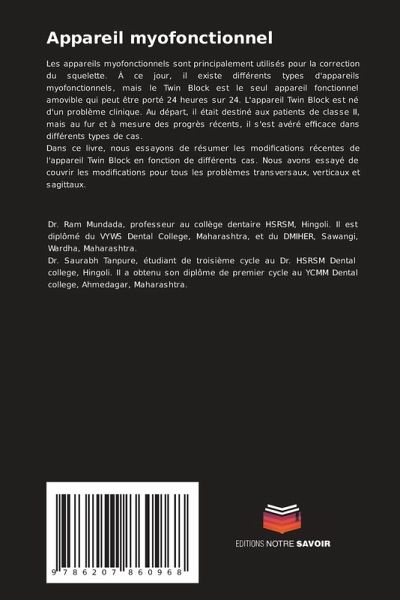 Les appareils myofonctionnels sont principalement utilisés pour la correction du squelette. À ce jour, il existe différents types d'appareils myofonctionnels, mais le Twin Block est le seul appareil fonctionnel amovible qui peut être porté 24 heures sur 24. L'appareil Twin Block est né d'un problème clinique. Au départ, il était destiné aux patients de classe II, mais au fur et à mesure des progrès récents, il s'est avéré efficace dans différents types de cas.Dans ce livre, nous essayons de résumer les modifications récentes de l'appareil Twin Block en fonction de différents cas. Nous avons essayé de couvrir les modifications pour tous les problèmes transversaux, verticaux et sagittaux.