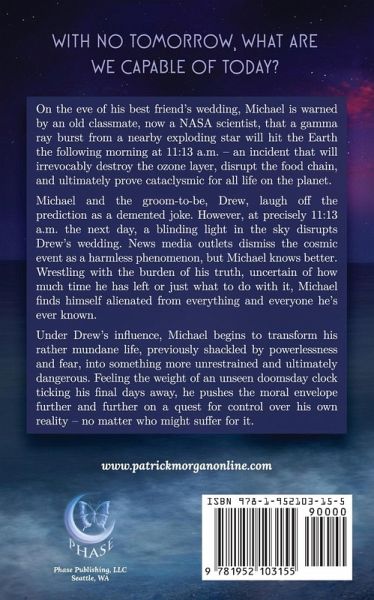 With no tomorrow, what are we capable of today? On the eve of his best friend's wedding, Michael is warned by an old classmate, now a NASA scientist, that a gamma ray burst from a nearby exploding star will hit the Earth the following morning at 11:13 a.m. - an incident that will irrevocably destroy the ozone layer, disrupt the food chain, and ultimately prove cataclysmic for all life on the planet. Michael and the groom-to-be, Drew, laugh off the prediction as a demented joke. However, at precisely 11:13 a.m. the next day, a blinding light in the sky disrupts Drew's wedding. News media outlets dismiss the cosmic event as a harmless phenomenon, but Michael knows better. Wrestling with the burden of his truth, uncertain of how much time he has left or just what to do with it, Michael finds himself alienated from everything and everyone he's ever known. Under Drew's influence, Michael begins to transform his rather mundane life, previously shackled by powerlessness and fear, into something more unrestrained and ultimately dangerous. Feeling the weight of an unseen doomsday clock ticking his final days away, he pushes the moral envelope further and further on a quest for control over his own reality - no matter who might suffer for it.