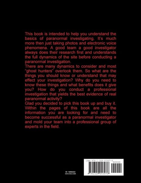 This book is intended to help you understand the basics of paranormal investigating. It's much more then just taking photos and electronic voice phenomena. A good team a good investigator always does their research first and understands the full dynamics of the site before conducting a paranormal investigation. ¿¿There are many dynamics to consider and most "ghost hunters" overlook them. So what are the things you should know or understand that may effect your investigation? Why do you need to know these things and what benefits does it give you? How do you conduct a professional investigation that yields the best evidence of real paranormal activity? Glad you decided to pick this book up and buy it. Within the pages of this book are all the information you are looking for and need to become successful as a paranormal investigator and mold your team into a professional group of experts in the field.