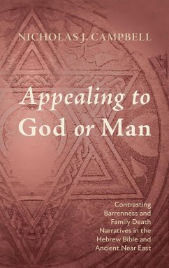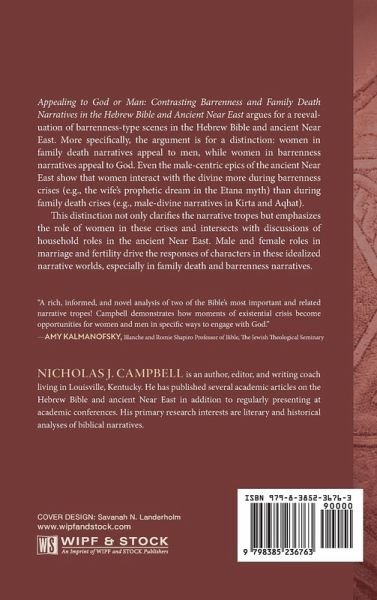 Appealing to God or Man: Contrasting Barrenness and Family Death Narratives in the Hebrew Bible and Ancient Near East argues for a reevaluation of barrenness-type scenes in the Hebrew Bible and ancient Near East. More specifically, the argument is for a distinction: women in family death narratives appeal to men, while women in barrenness narratives appeal to God. Even the male-centric epics of the ancient Near East show that women interact with the divine more during barrenness crises (e.g., the wife's prophetic dream in the Etana myth) than during family death crises (e.g., male-divine narratives in Kirta and Aqhat). This distinction not only clarifies the narrative tropes but emphasizes the role of women in these crises and intersects with discussions of household roles in the ancient Near East. Male and female roles in marriage and fertility drive the responses of characters in these idealized narrative worlds, especially in family death and barrenness narratives.